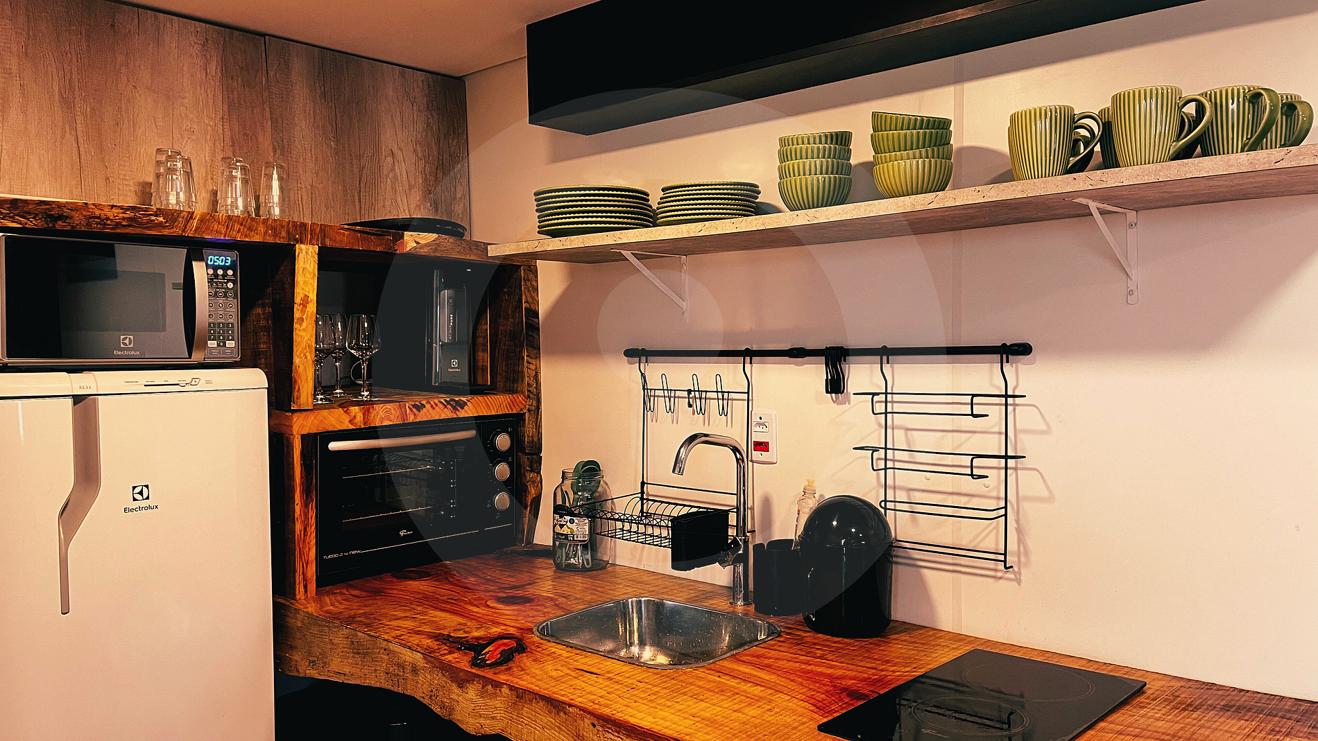 Cuenta con chimenea interna, ventanas panorámicas con vista al bosque de araucarias y al espejo de agua de la represa, además de cocina equipada con lo esencial para preparar comidas. El área exterior es uno de los principales atractivos, con un amplio espacio para contemplación y ocio.