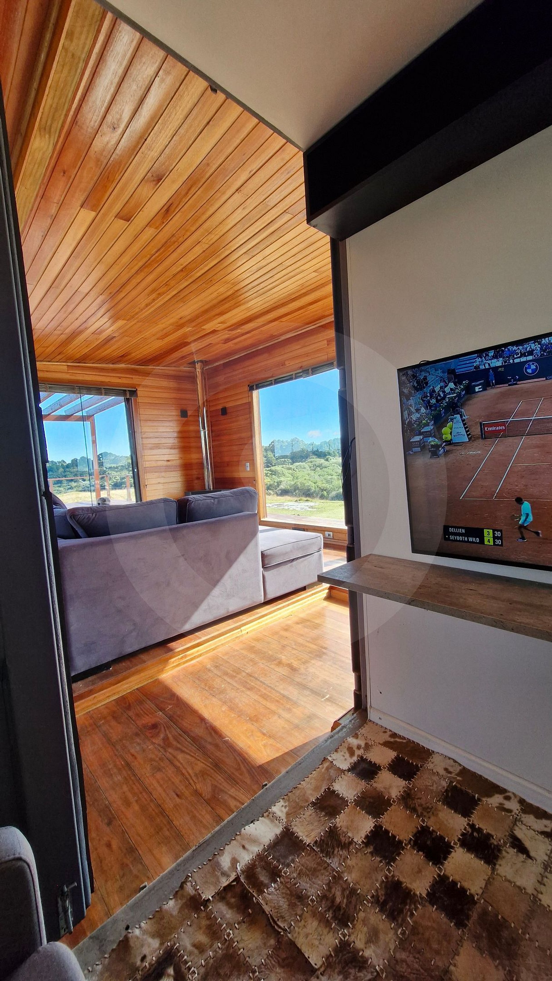 Nuestra construcción de madera alrededor de una casa contenedor conserva el ambiente rústico y, al mismo tiempo, ofrece la modernidad y sofisticación de una cabaña de lujo, con detalles que recuerdan la vida en la sierra. Las ventanas panorámicas permiten contemplar el paisaje incluso en días nublados. El diseño de planta abierta integra sala de chimenea, sala de TV y espacio para comer, además de una cocina compacta, perfecta para preparar comidas caseras mientras disfruta del panorama exterior.