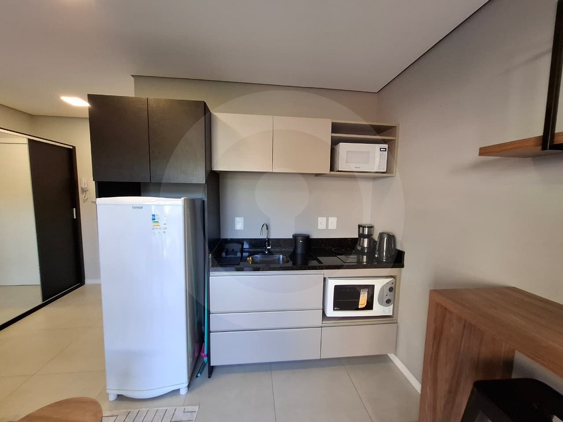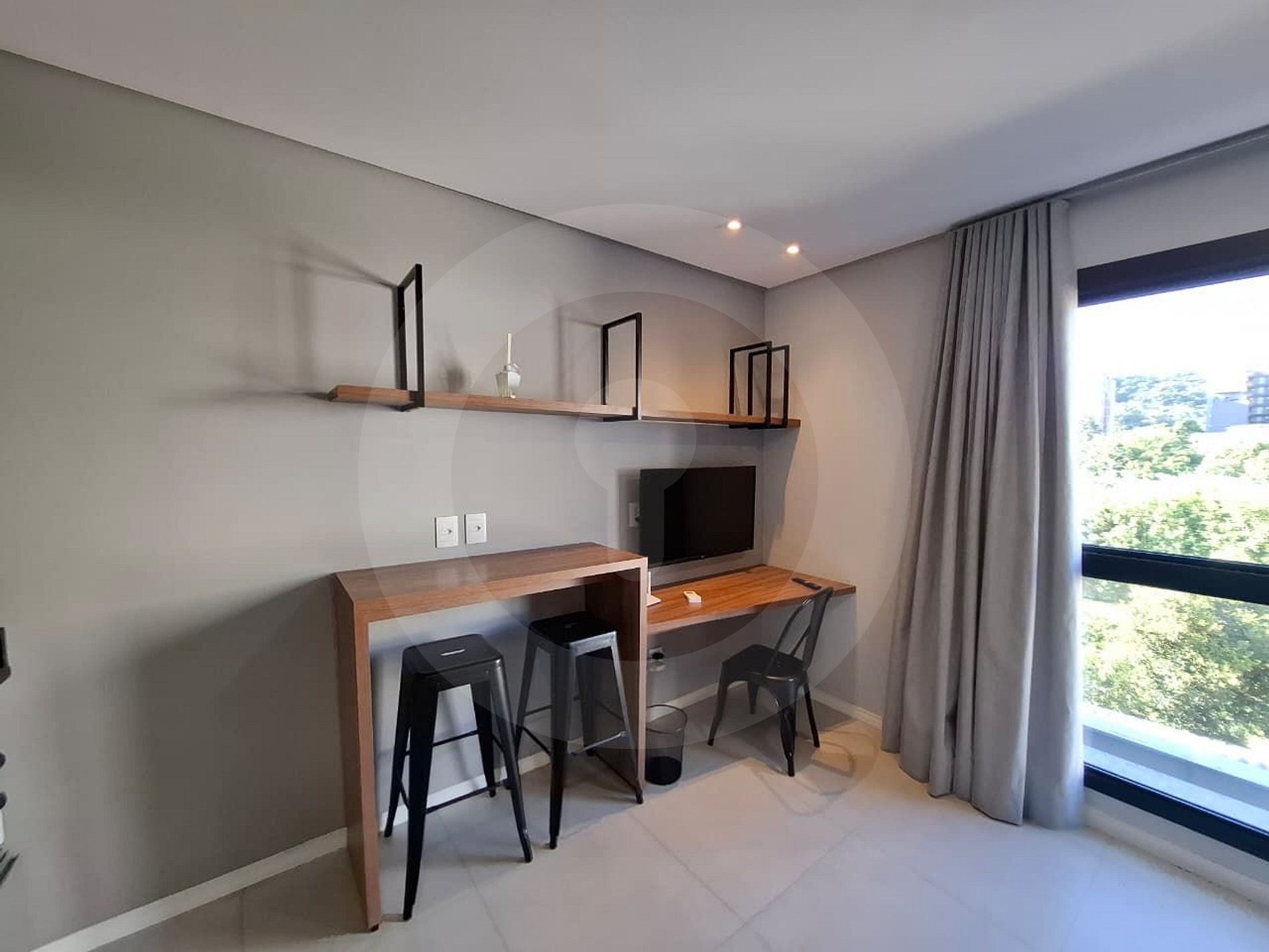 Studio completo e molto funzionale, perfetto per chi studia, lavora o vuole scoprire la città. Ambiente open space con letto matrimoniale, divano, TV e spazio home office integrato. Cucina americana attrezzata con piano cottura, microonde, frigorifero e bancone multifunzione — ideale per pasti veloci o studio. Condominio con lounge all'aperto, camino ecologico, area chimarrão, palestra, deposito biciclette e area per animali.