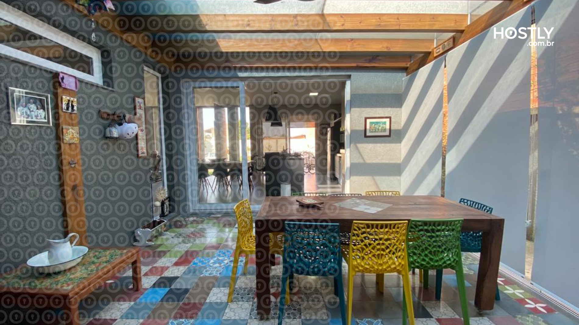 A área externa coberta com teto de vidro é um destaque especial, proporcionando um espaço agradável para desfrutar à luz ambiente, independentemente das condições climáticas.
